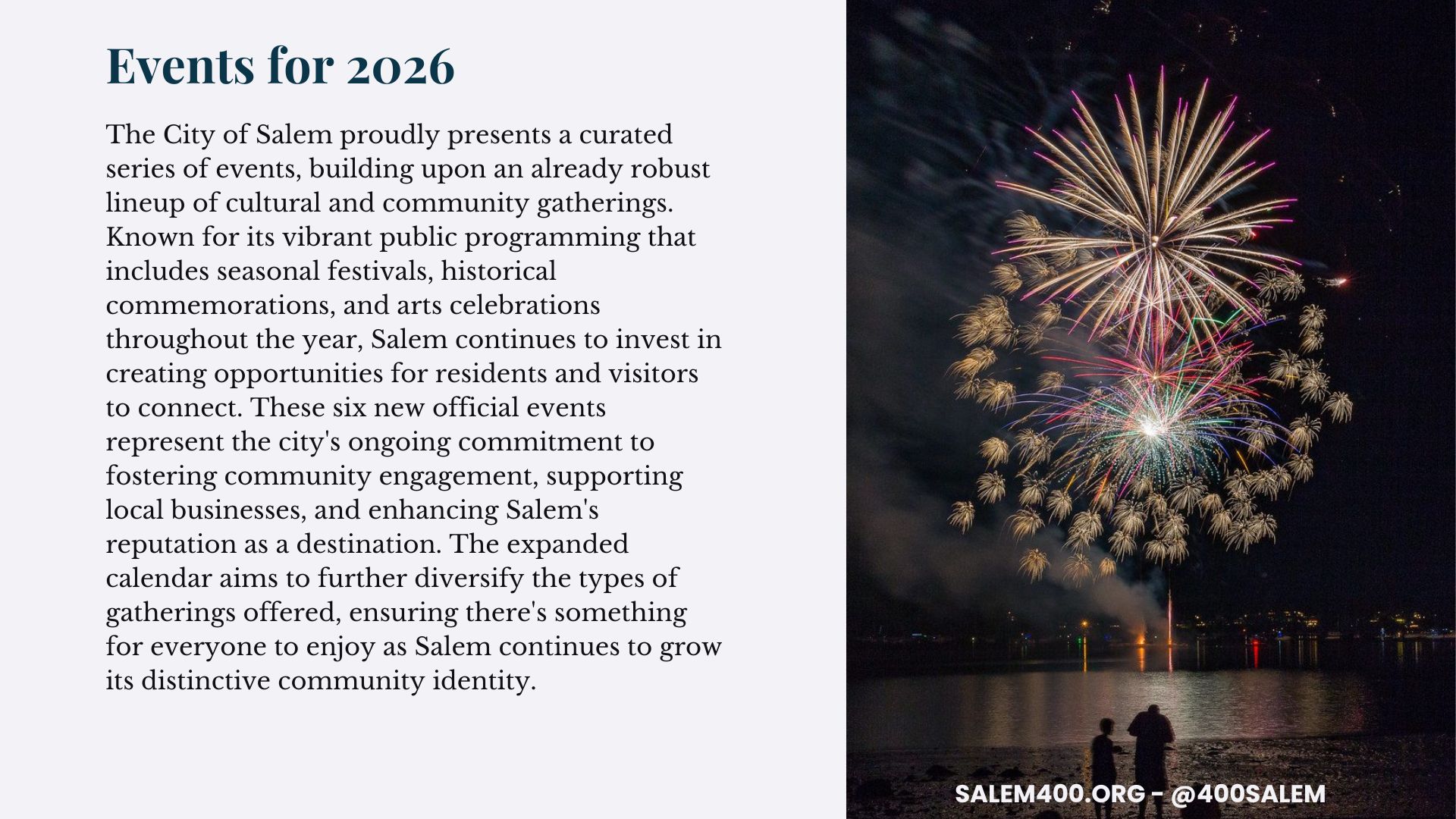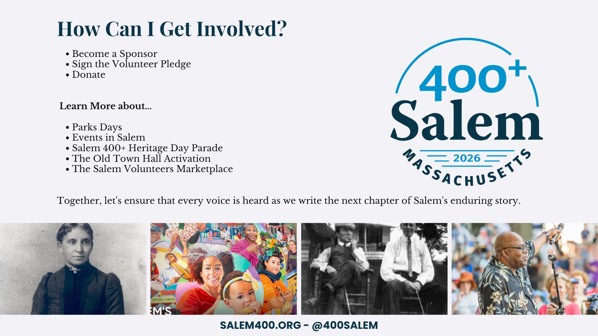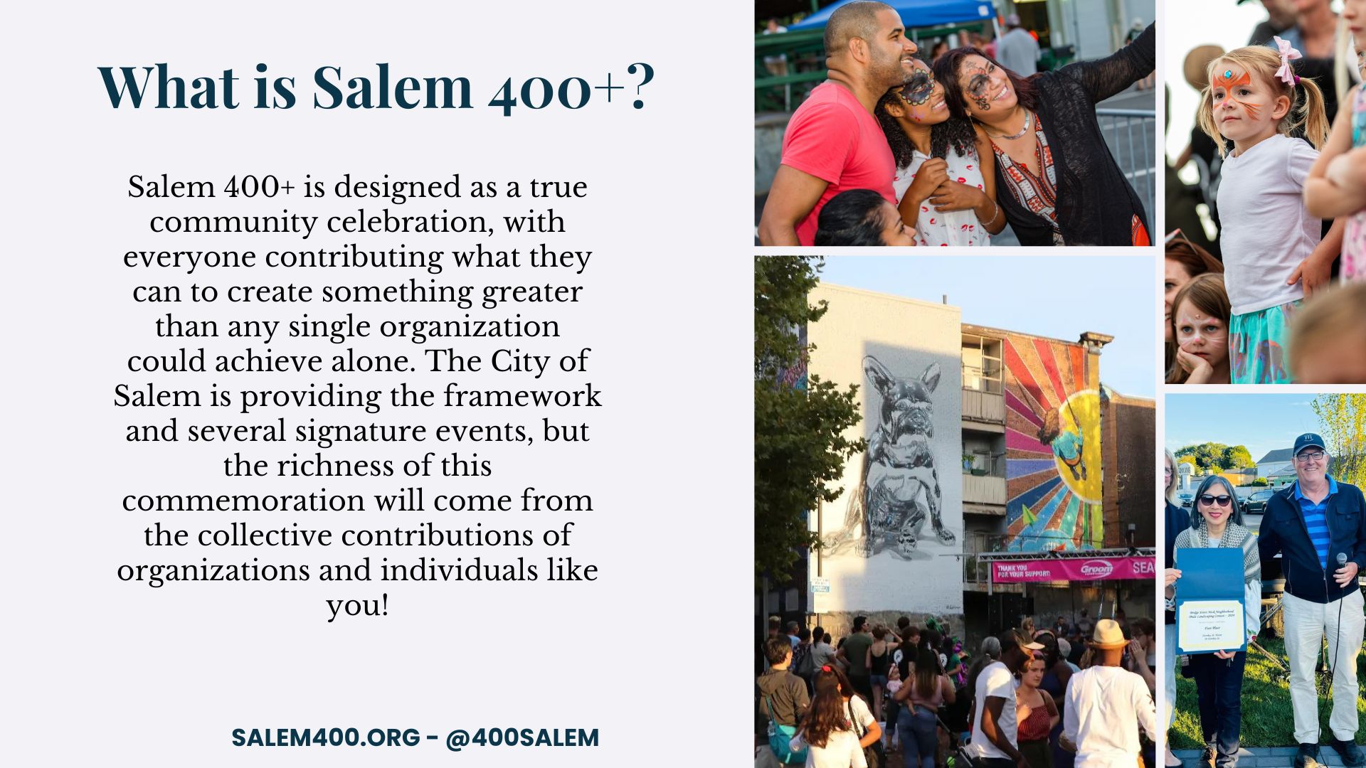 For more information about Salem 400+ or to learn about volunteer opportunities, residents can visit Salem400.org. See below to see the slides that were presented at the presentation.