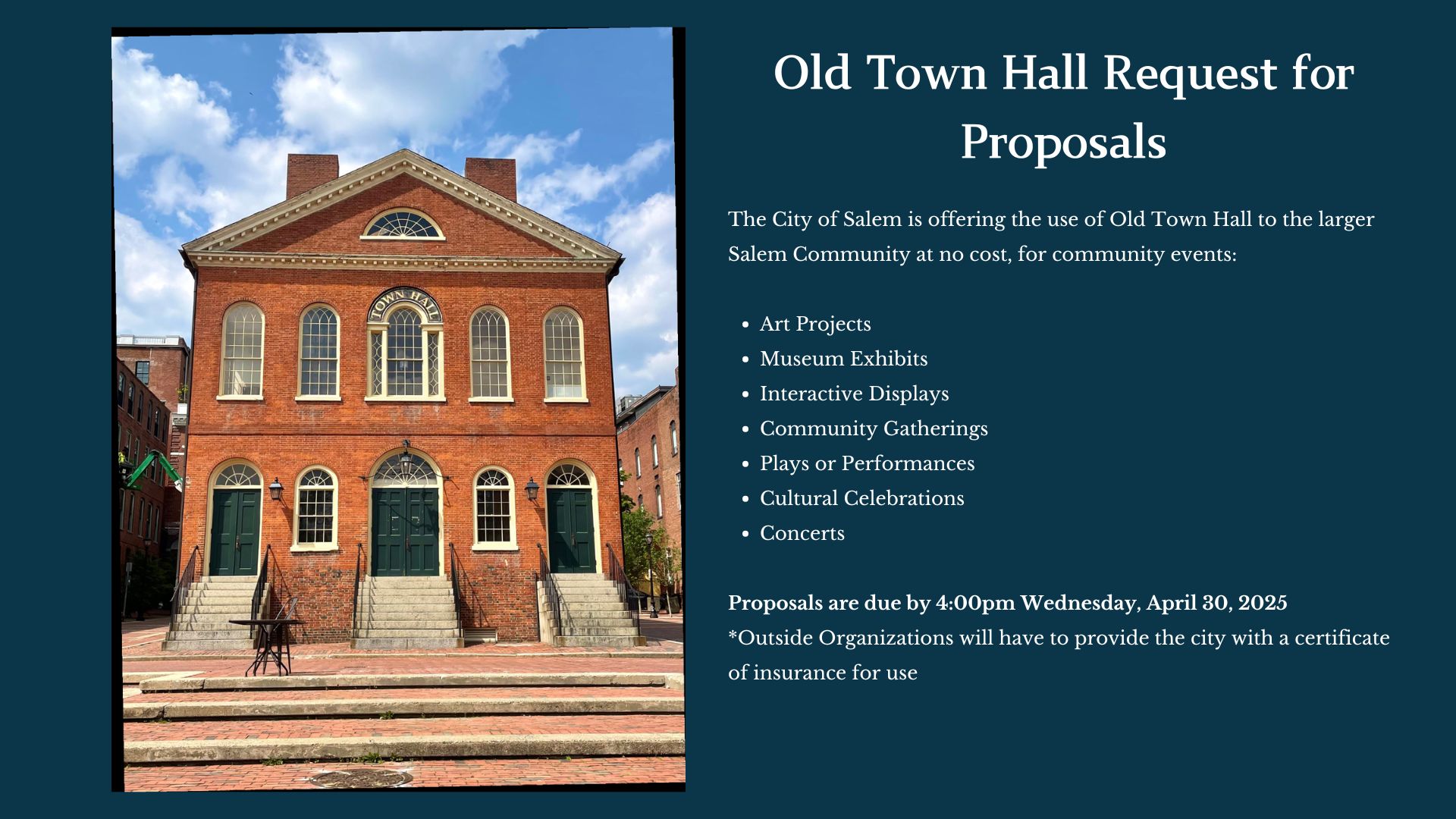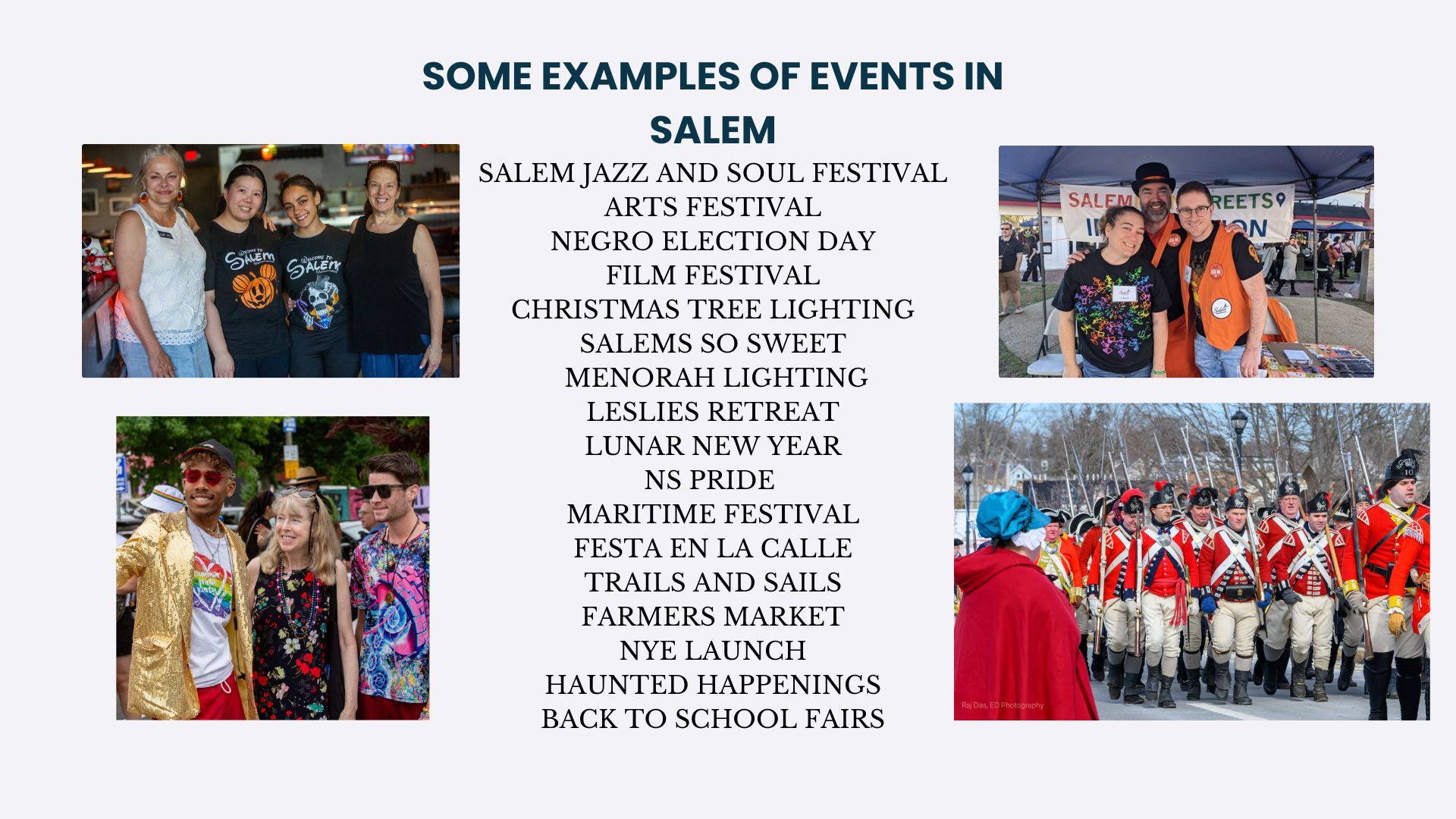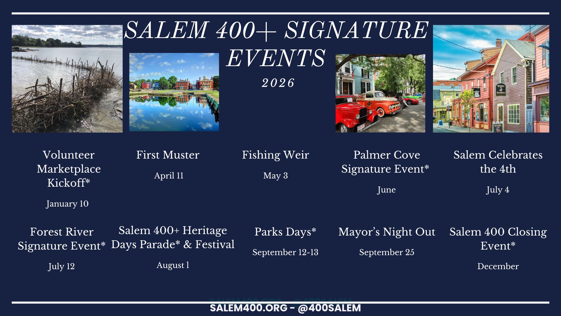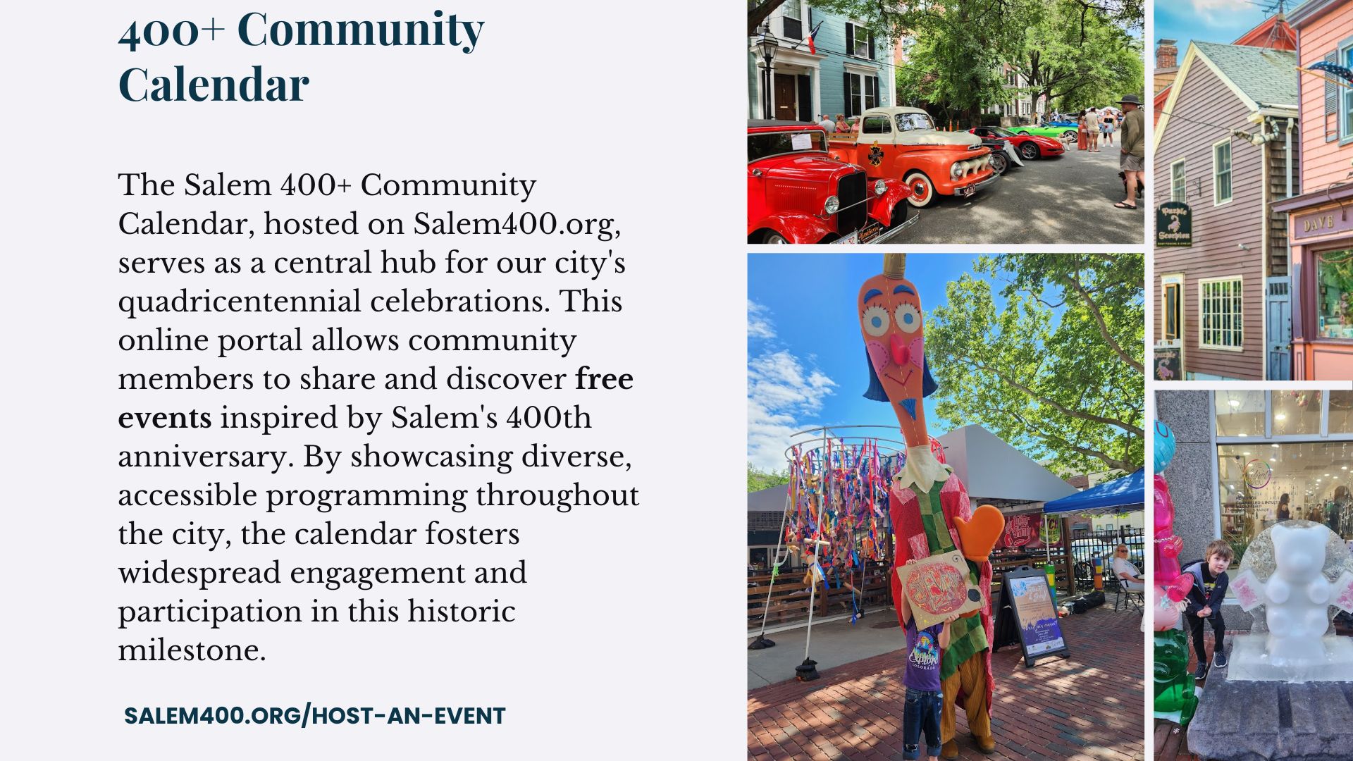 Salem 400+ is designed as a true community celebration, with everyone contributing what they can to create something greater than any single organization could achieve alone. The City of Salem is providing the framework and several signature events, but the richness of this commemoration will come from the collective contributions of organizations and individuals.