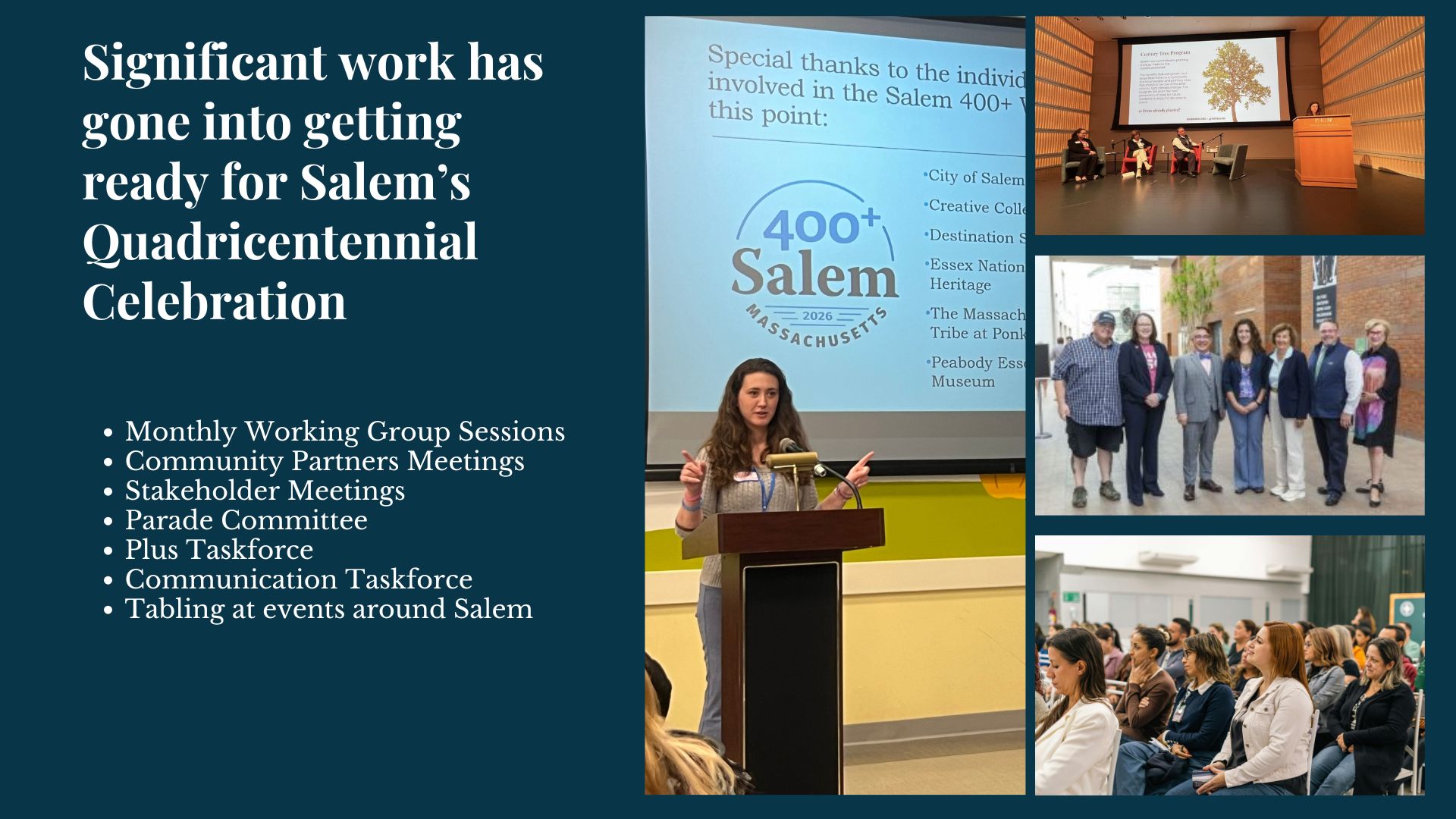 Attendees learned about the Salem400.org website, which serves as a central gateway for community engagement. The site features a reading list of Salem-inspired stories, news about the quadricentennial initiative, information about the Century Tree program and signature parks, and a community calendar for free events related to the 400th anniversary celebration.